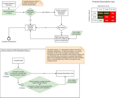 Use case: The AI-Complaints-Assistant streamlines complaint intake in call centers by using AI to apply a medical device reportability engine, which offers predictive scoring to determine if a complaint is reportable, sparing manual research of MAUDE records. It optimizes resource usage and prioritizes RA/QA review for timely MDR submissions by assessing the likelihood of FDA reportability based on MAUDE history, rather than just matching data. In addition it also creates pre-populated FDA Form 3500 forms for complaints with high reportability scores, to further expedite the process and improving efficiency.